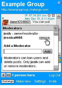 | Chatango provides multiple moderation mechanisms that allow group chat owners (i.e. users that created the group chats) and moderators that they make to ban unwanted users and delete their messages. Please click here for more information.